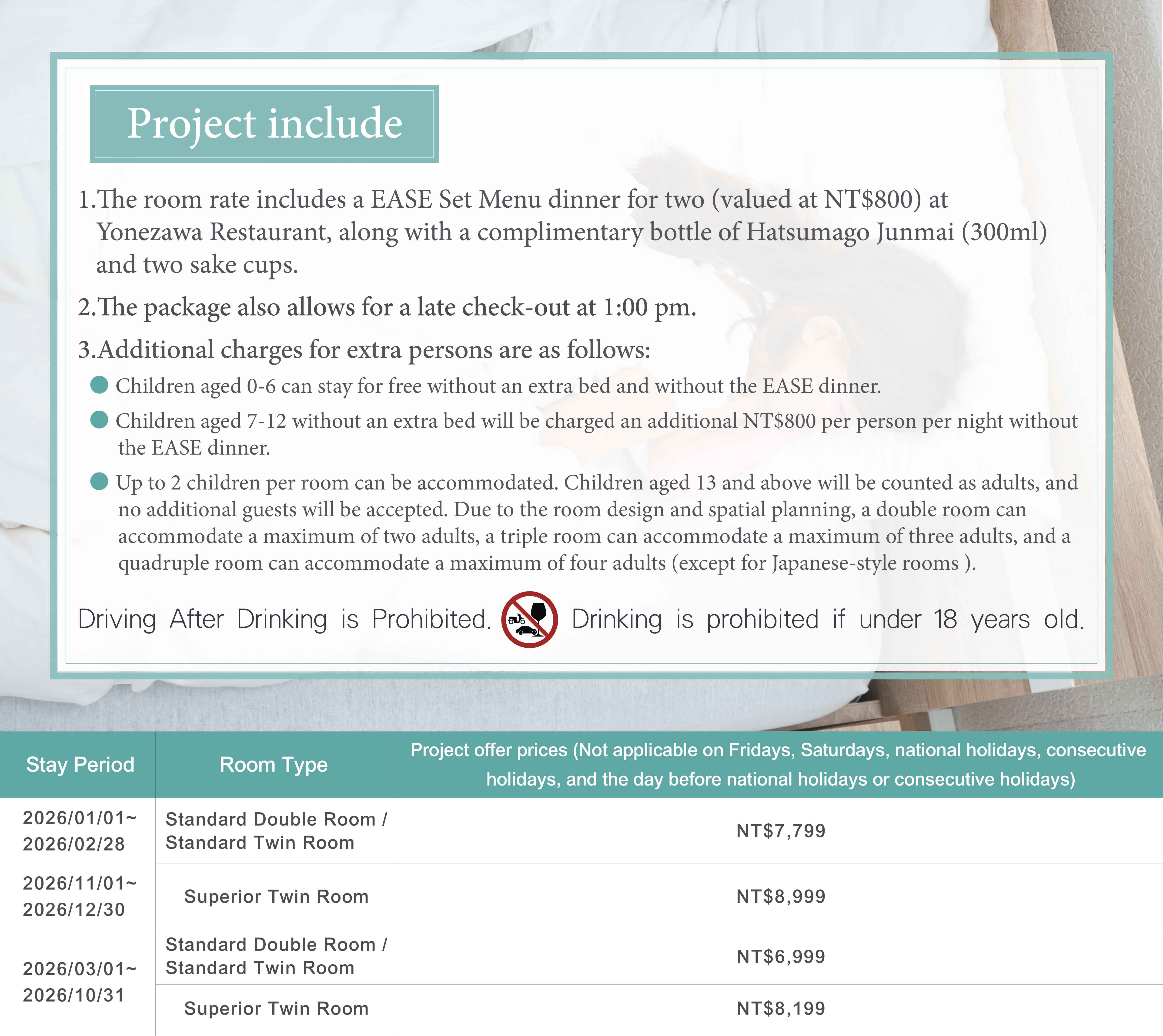 2026/01/01~2026/12/30, Not applicable on Friday, Saturday, national holidays, consecutive holidays, and the day before national holidays or consecutive holidays.