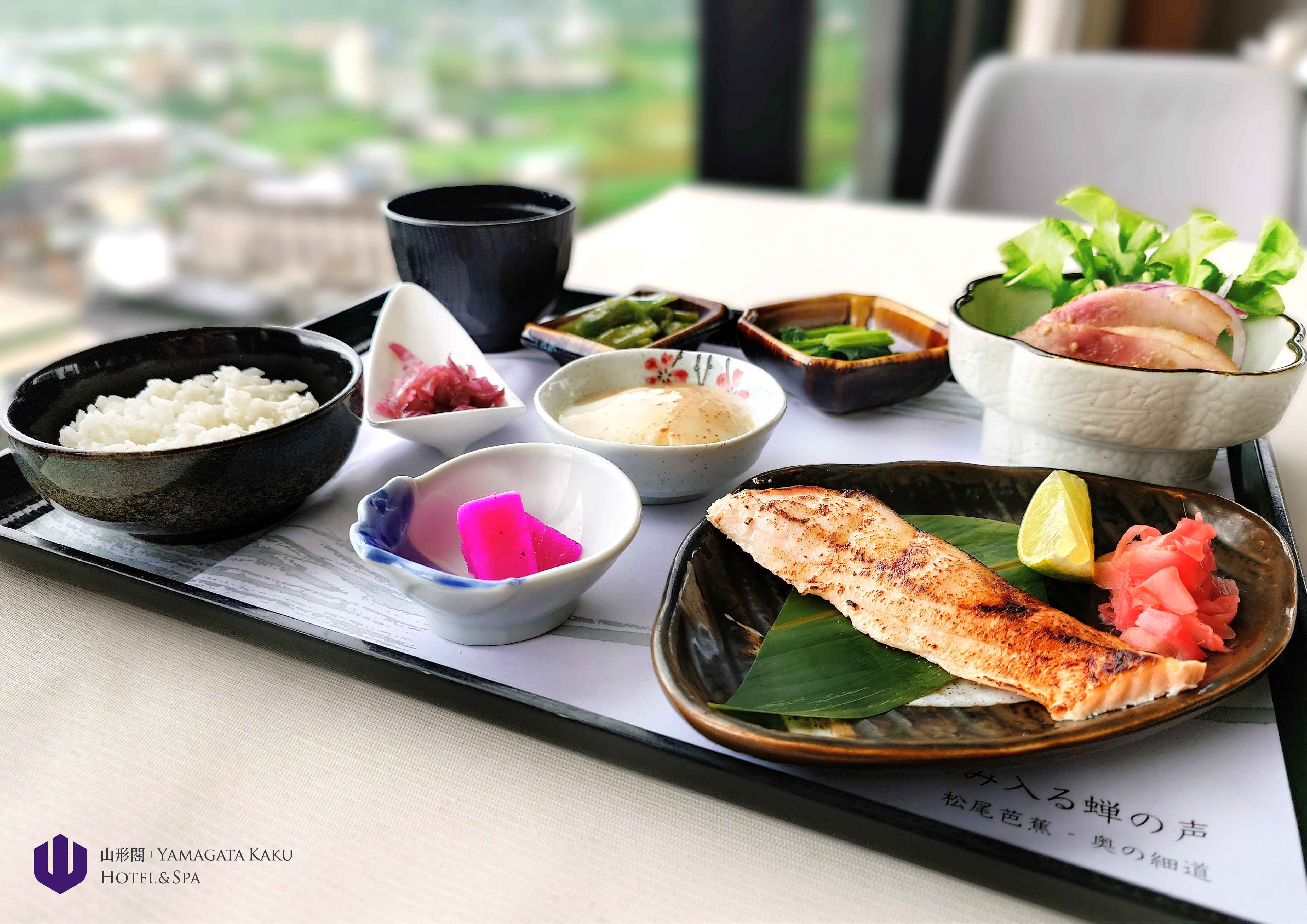 日本美姬米炊飯、炙燒鹽麴甘糀鮭魚、溫泉蛋、柚香蘿蔔、 醬醋鮮菠菜、櫻桃鴨胸沙拉、海帶芽吻魚味噌湯